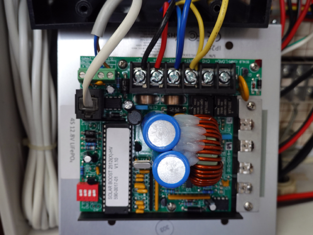 新しいDC/DCコンバーターに交換し、負荷電源はSB-3024iLDから取ることにした。BlueSky社のシステムは、マスターのみ負荷への電力供給ができる。出力先の変更を行う為に、チャージコントローラーのマスターとスレーブをDIPスイッチを使って入れ替えることにした。(SB-3024iLDがマスター#0で、SB-2512iXがスレーブ#1にする。)無事修理完了だ。 | |